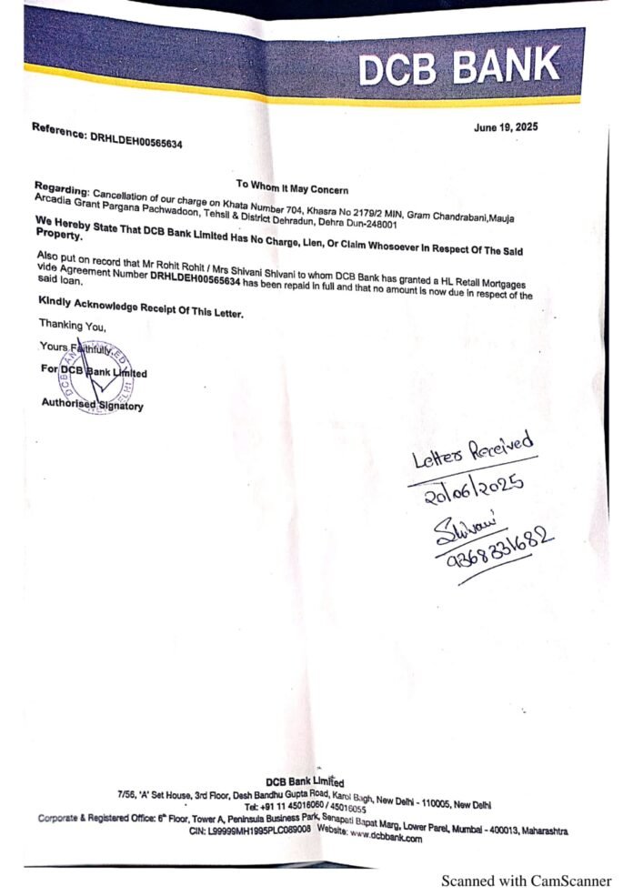 जिलाधिकारी का कड़ा रूख देख बैंक द्वारा शिवानी गुप्ता के सम्पति के कागज तो लौटाये ही साथ 15.50 लाख ऋण माफ करते हुए नो ड्यूज का सर्टीफिकेट भी घर जाकर दिया। जिलाधिकारी के जनता दर्शन कार्यक्रम में शिवानी गुप्ता पत्नी स्व0 रोहित निवासी अमर भारती, चन्द्रबनी अपनी फरियाद लेकर पहुंची थी। शिवानी गुप्ता ने बताया कि उनके पति द्वारा डीसीबी प्रा0 लि0 बैंक से 15.50 लाख का ऋण लिया था, जिसका बीमा आईसीआई लोंबार्ड कंपनी द्वारा किया गया था। उनके पति का 15 मई 2024 आकस्मिक निधन हो गया था। शिवानी गुप्ता ने बताया कि पति की मृत्यु के बाद उनकी आय का कोई साधन न होने के कारण बैंक किस्त जमा नही हो पा रही है। बीमा कम्पनी द्वारा बैंक लोन देने से मना किया जा रहा है। डीसीबी बैंक व बीमा कंपनी से इस संबंध में कई बार अनुरोध किया है, परंतु बीमा कंपनी द्वारा धनराशि दिए जाने में अनावश्यक विलंब किया जा रहा है और बैंक द्वारा बार-बार किश्त जमा करने का दबाव बनाया जा रहा है। जिस पर डीएम ने बैंक प्रबन्धक डीसीबी प्रा0लि0 को उपस्थित होने और महिला की समस्या का निस्तारण करने के निर्देश दिए थे। जिला प्रशासन द्वारा 09 जून को सम्बन्धित बैंक प्रबन्धक के विरुद्ध ब्याज सहित रू0 1705000 आरसी जारी करते हुए 16 जून तक आरसी जमा करने के निर्देश दिए गए थे। डीसीबी प्रबंधक को बार-बार नोटिस जारी करने के बाद भी उक्त प्रकरण पर कोई कार्रवाई नहीं की गई थी। जिलाधिकारी के आदेश और असिस्टेंट कलेक्टर प्रथम श्रेणी के निर्देशों पर 18 जून,2025 को देहरादून क्रॉस मॉल, राजपुर रोड स्थित डीसीबी शाखा की चल संपत्ति को नियमानुसार कुर्की करते हुए बैंक शाखा को सीज किया कर दिया था।