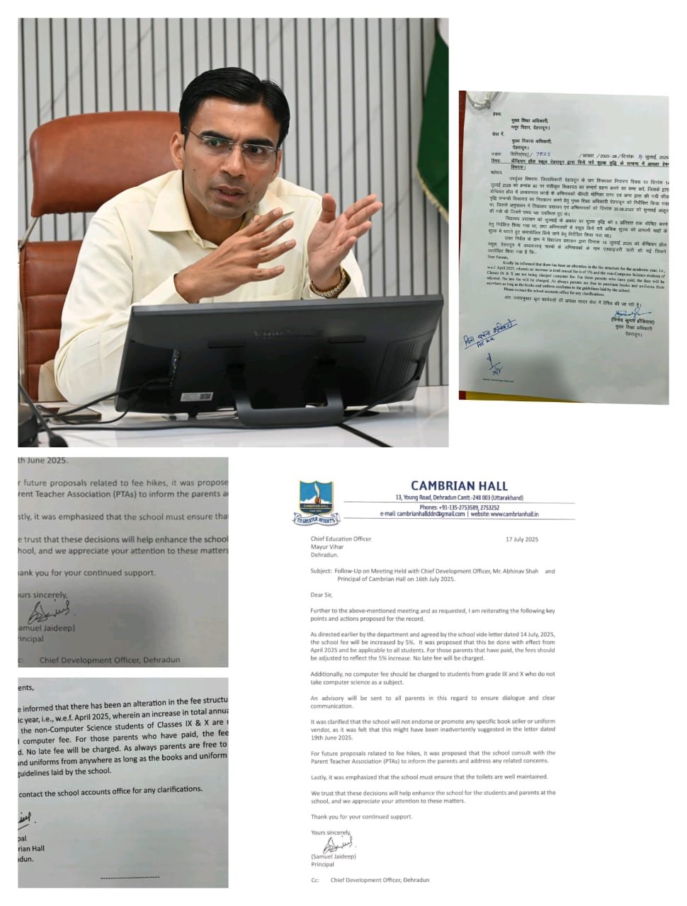 मा0 मुख्यमंत्री के निर्देश और जिला प्रशासन के आक्रामक रवैये से कैंब्रियन हॉल स्कूल अब बैकफुट पर आ गया है। स्कूल ने मनमाने तरीके से 10 प्रतिशत फीस वृद्वि को 05 प्रतिशत कम कर दिया है। जिलाधिकारी सविन बंसल के निर्देशों पर नियमों का पालन न करने वाले स्कूलों के खिलाफ कडा एक्शन लिया जा रहा है। जिला प्रशासन द्वारा स्कूल पर सख्त प्रवर्तन एक्शन के बाद अभिभावकों को बड़ी राहत मिली है।