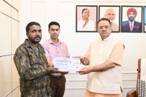 सांप के काटने से मृत्यु होने पर परिवार को मुआवजा राशि का चैक प्रदान करते कैबिनेट मंत्री गणेश जोशी