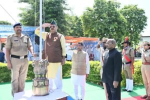 रूद्रपुर में आयोजित स्वतंत्रता दिवस समारोह में प्रतिभाग कर 78वें स्वतंत्रता दिवस के अवसर पर झण्डारोहण करते जनपद प्रभारी एवं कृषि मंत्री गणेश जोशी