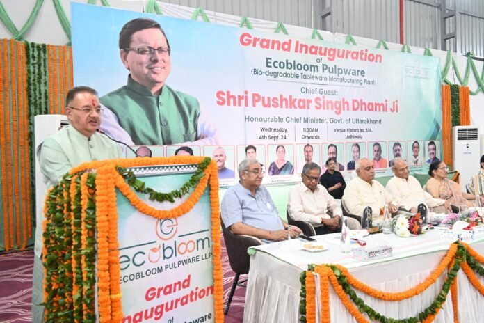 नव निर्मित ईकोब्लूम पल्पवेयर (वायो डि ग्रेडेबल टेबलवेयर मैन्युफैक्चरिंग प्लांट) की नवीन इकाई के शुभारम्भ करते कैबिनेट मंत्री गणेश जोशी