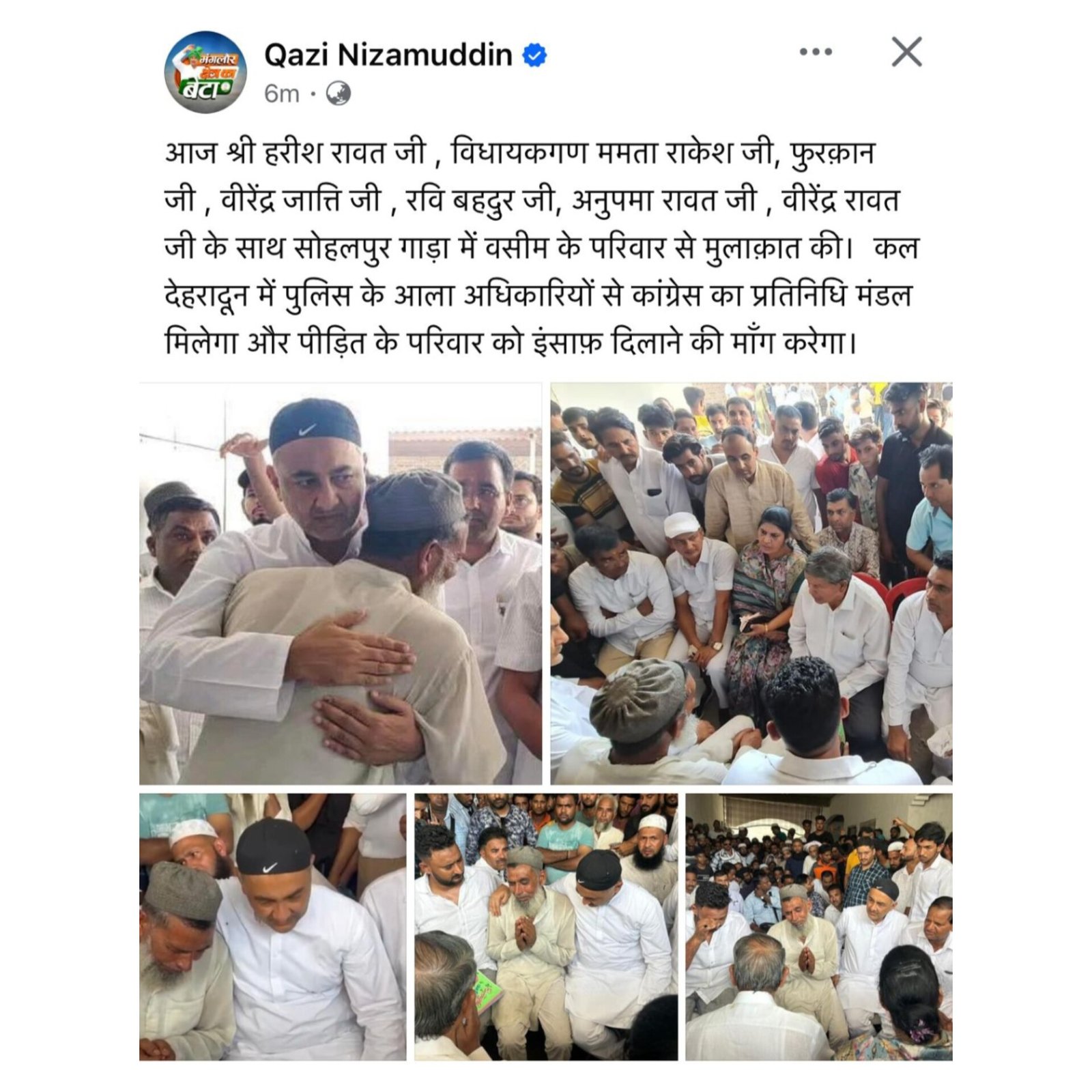 तो वही उत्तराखंड में विपक्ष में बैठी कांग्रेस… के दिग्गज नेताओ का वसीम उर्फ़ मोनू के घर में लगातार आना-जाना बना हुआ है… वह उनके परिवार के साथ जहा खड़े है, वही धरना प्रदर्शन.. के माध्यम से, वसीम को इंसाफ दिलाने की मांग कर रहे हैं…. हरीश रावत से लेकर कांग्रेस के सभी दिग्गज नेता विधायक… वसीम के परिवार से मिलने पहुंचे, और उनको हर संभव मदद का आश्वासन दिया… नेताओं की गले मिलती तस्वीरें भी वायरल है… जो यह बताती है कि कांग्रेस के सभी नेता वसीम के परिवार के साथ खड़े हैं….