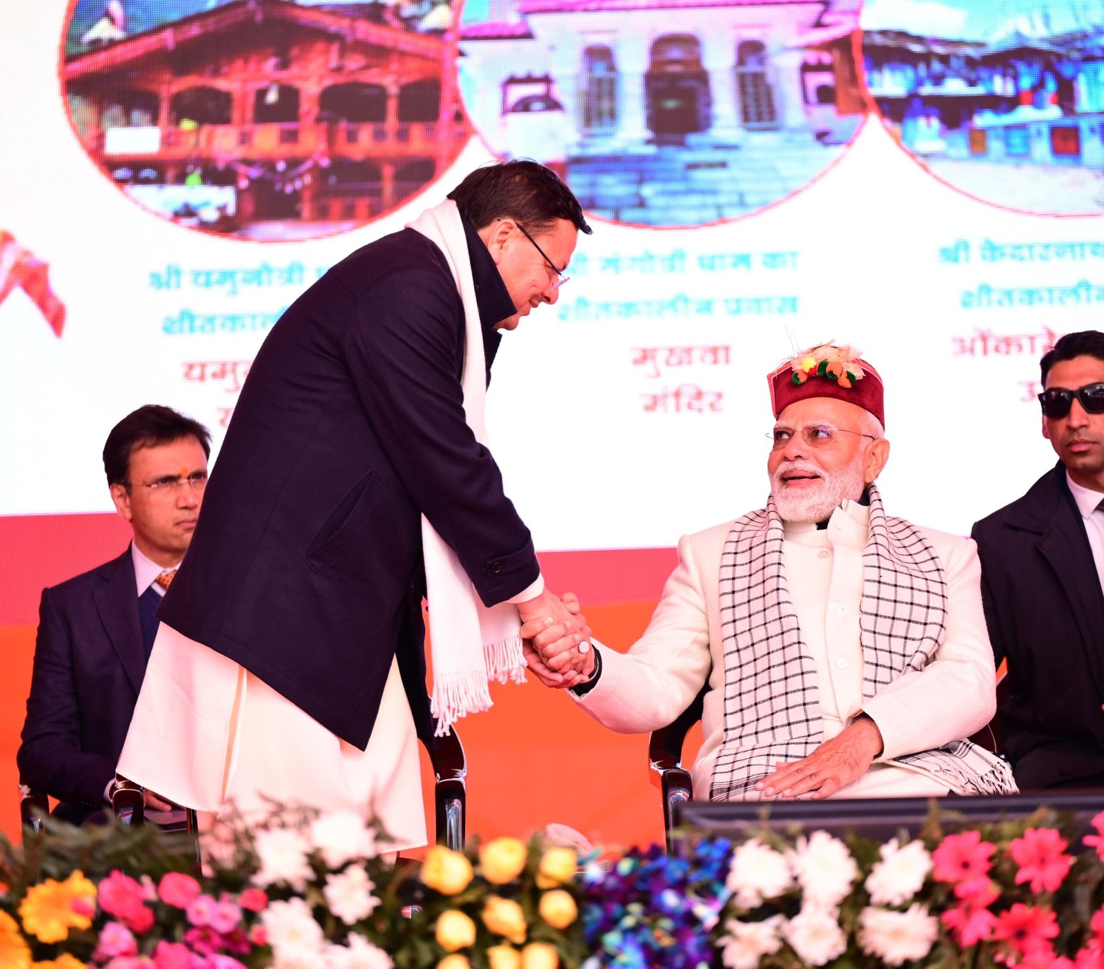 शीतकालीन यात्रा पर आए प्रधानमंत्री नरेंद्र मोदी के साथ मुख्यमंत्री पुष्कर सिंह धामी की शानदार बाॅंन्डिग गुरूवार को भी दिखी। प्रधानमंत्री को जब जहां मौका मिला, वह मुख्यमंत्री को शाबासी देते, प्रोत्साहित करते हुए दिखाई दिए। भाषण खत्म कर मुख्यमंत्री जैसे ही प्रधानमंत्री के करीब पहुंचे, तो पहले तो उन्होंने गर्मजोशी से हाथ मिलाया। बाद में मुख्यमंत्री की पीठ भी थपथपा दी।